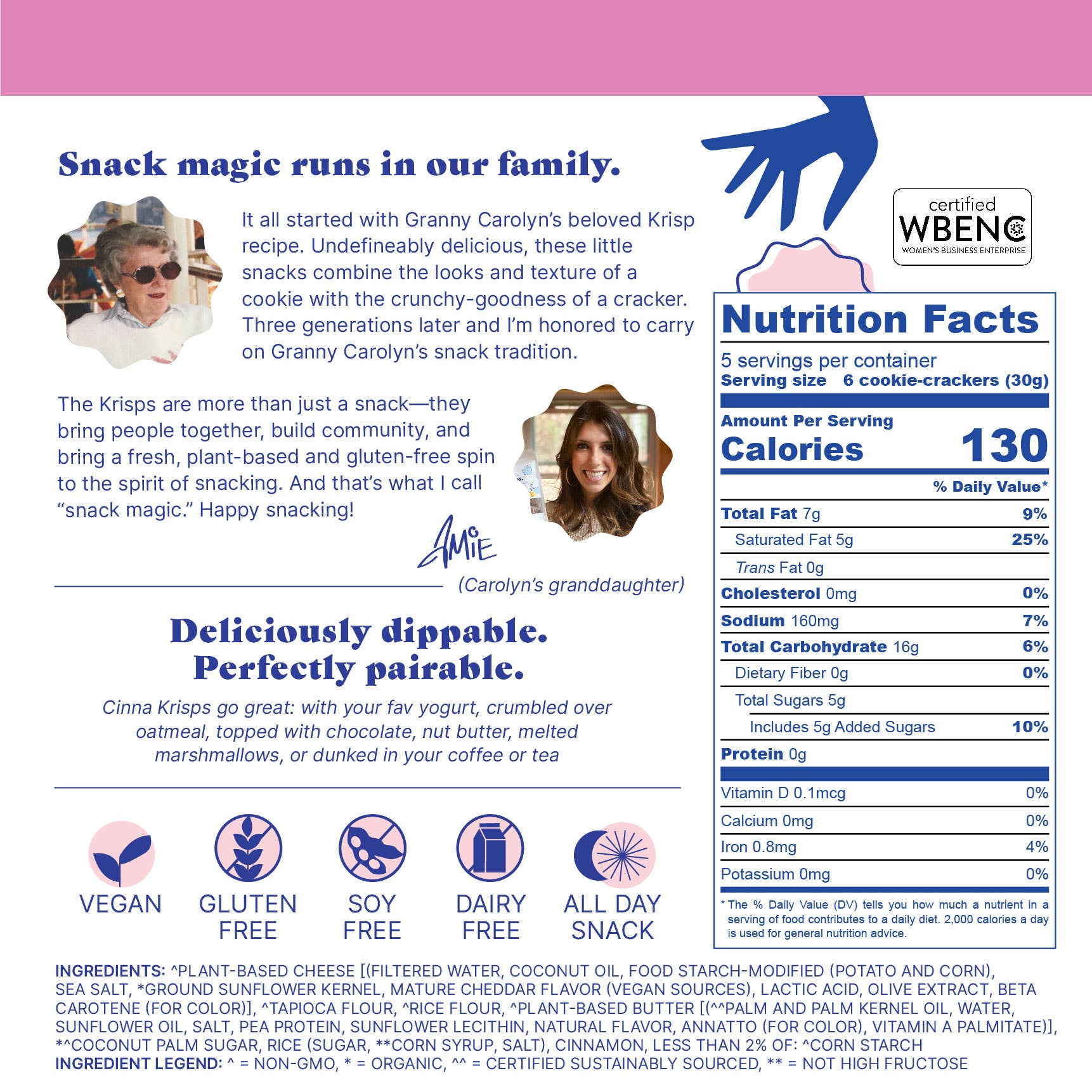 Our Cinna Krisp is reminiscent of a childhood favorite—cinnamon and sugar on buttered toast. Also, reminds us of a grown-up version of a childhood cereal (cinnamony, toasty, crunchy) we all know so well.