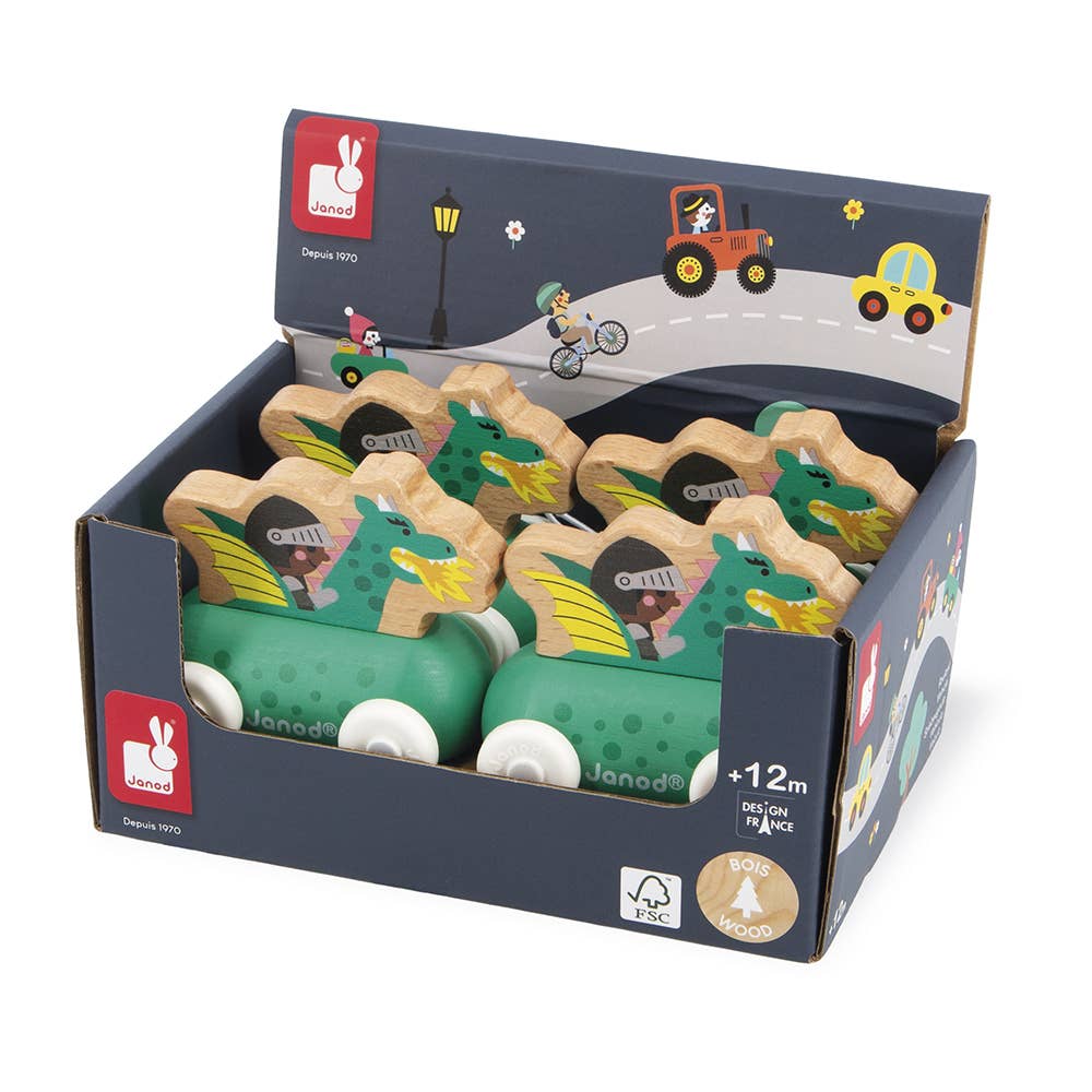 The knight astride his dragon is ready to defend the castle! Create many a game and adventure with this dragon-shaped push-along vehicle. Thanks to its shape, this push-along vehicle can easily be grasped by little ones. Toy for children aged 12 months and up Combine this push-along car with its mat and cool block set in the same Janod range to perfectly complete the universe.