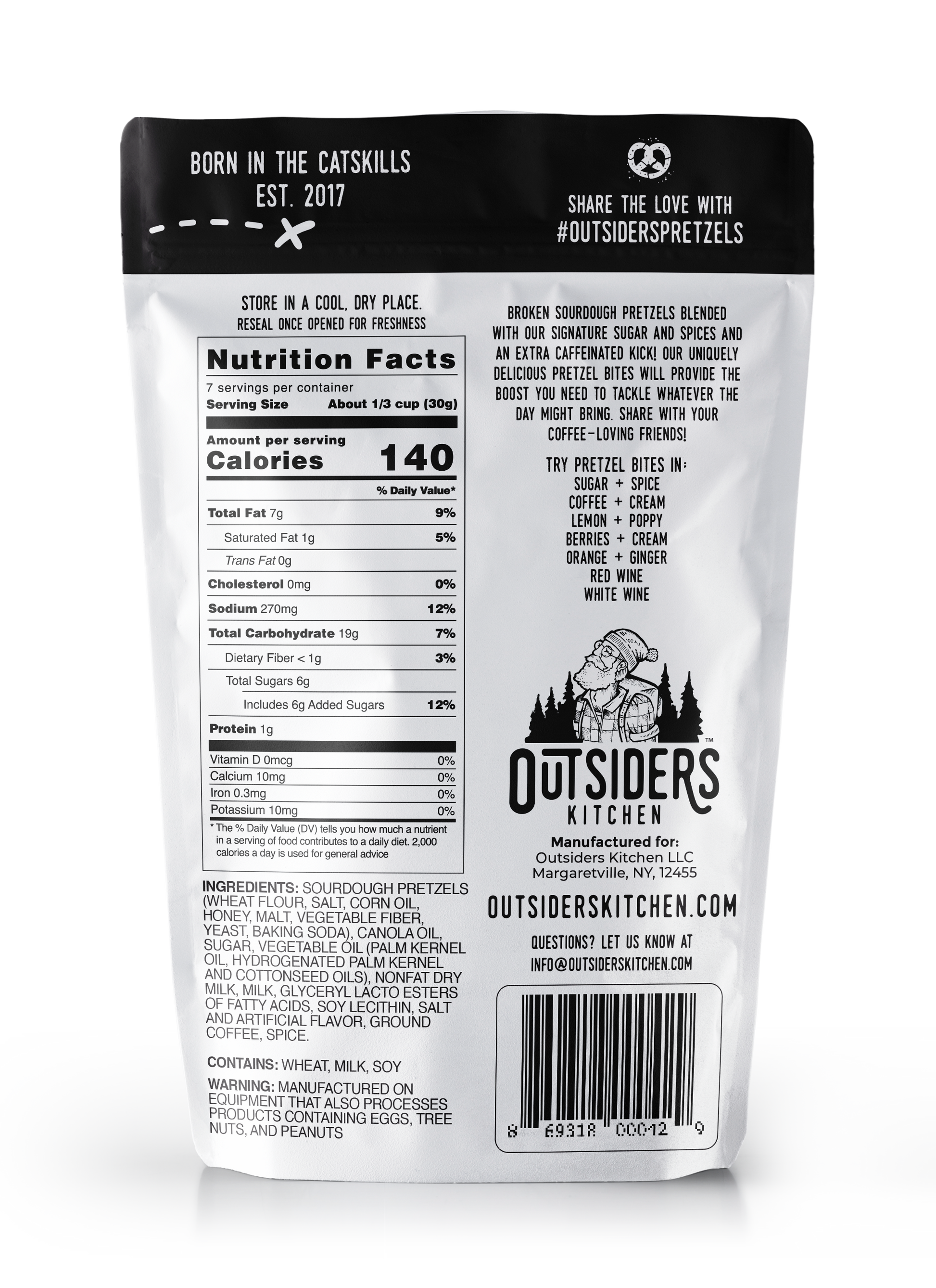 Get a pick-me-up in the best way possible with our Coffee + Cream Pretzel Bites! Our blend of freshly ground whole bean coffee with a hint of cinnamon and cream are infused into broken sourdough pretzels, offering a deliciously satisfying combination of sweet and salty. A great energy-boosting snack for coffee lovers on-the-go, these pretzel bites can help you wind up (think: conquering a mountain of laundry) or wind down (think: indulging in some much-needed relaxation). Plus, they make a great gift for all the coffee lovers in your life. So go ahead and treat yourself - or someone else - to a little burst of deliciousness with our Coffee + Cream Pretzel Bites!