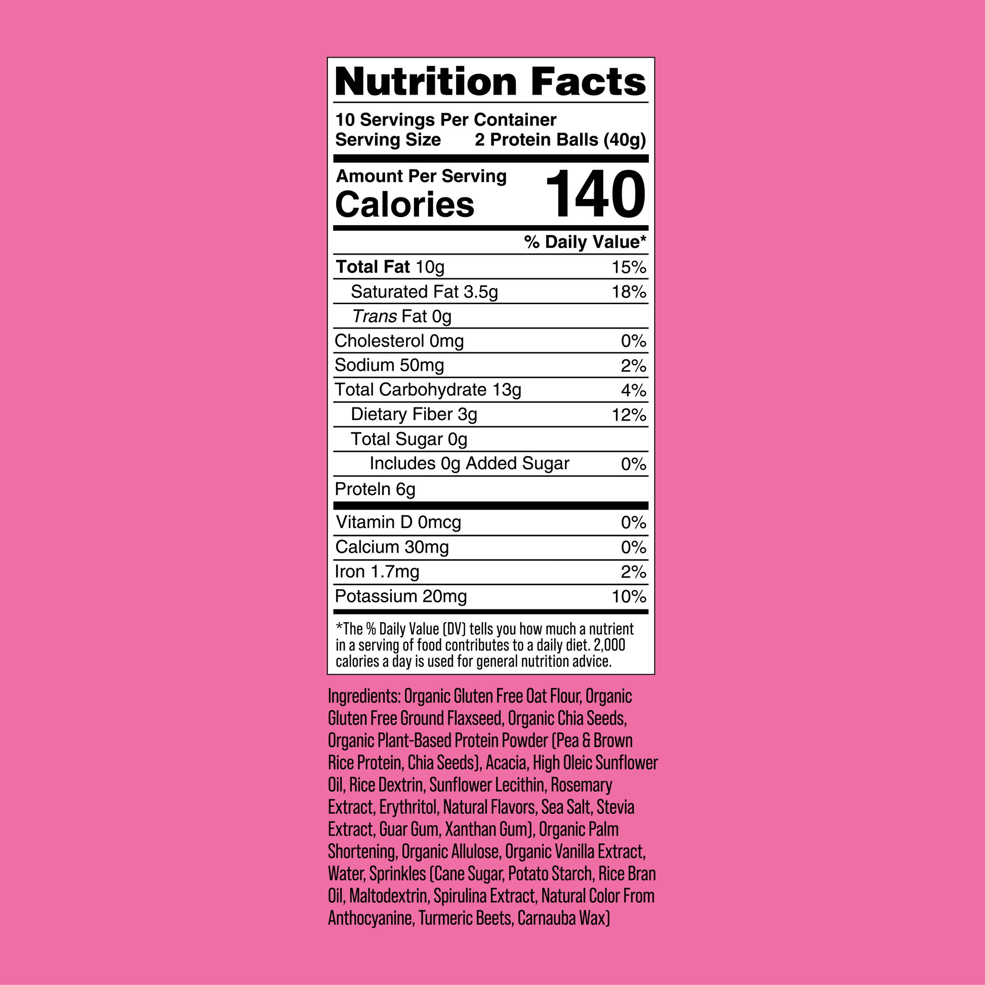 We added colorful sprinkles to our protein base because we believe healthy choices don't have to look serious all the time. These balls deliver nostalgic cake batter flavor without the post-party regret of actual cake. Perfect for when your day needs a little celebration but your body needs actual nutrients.