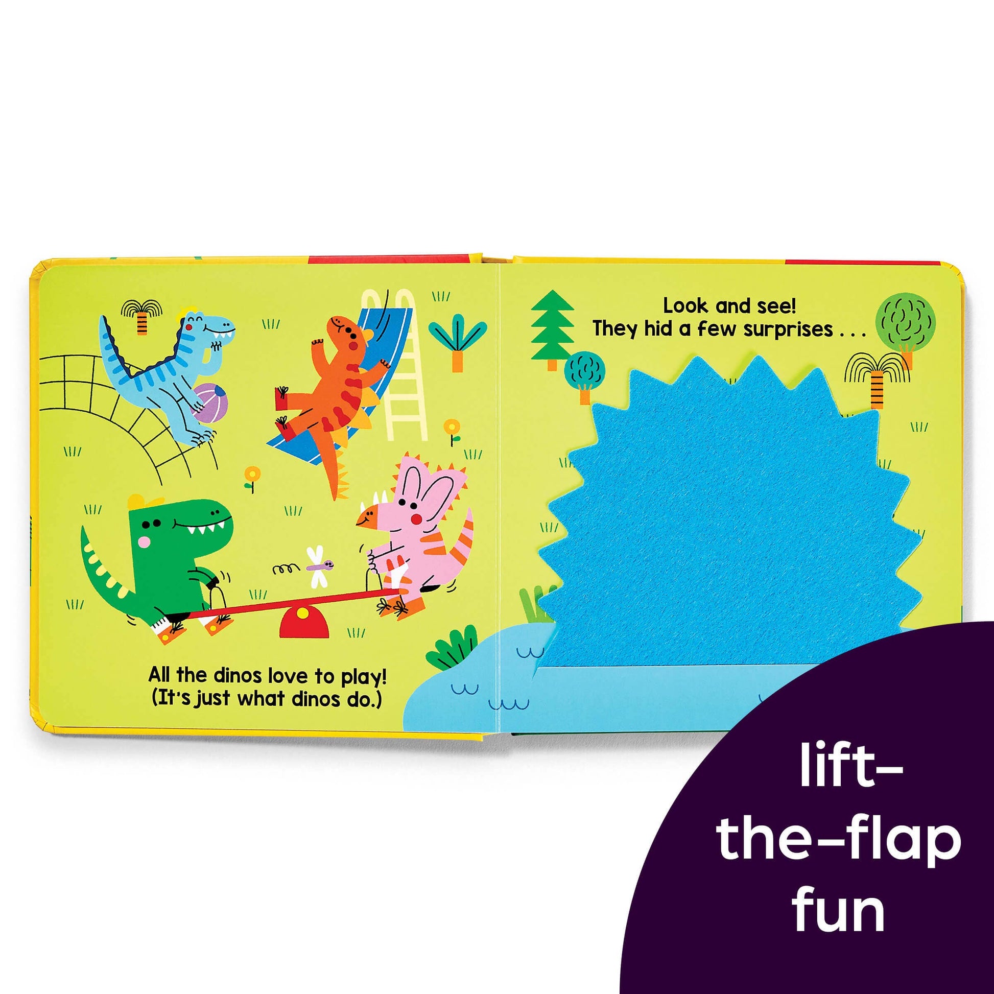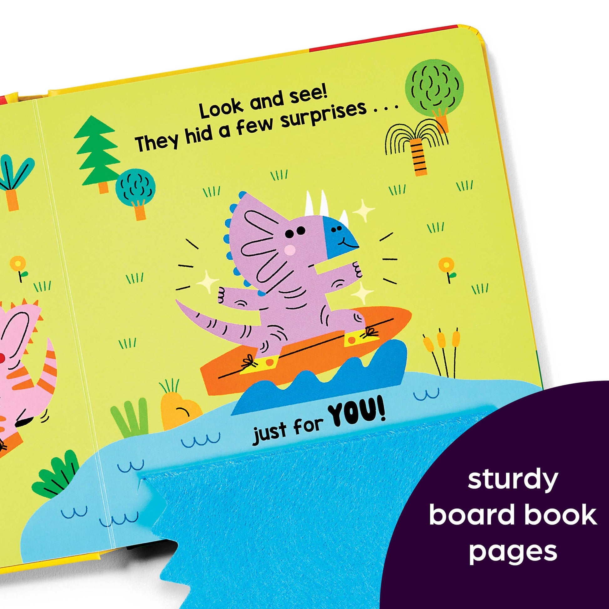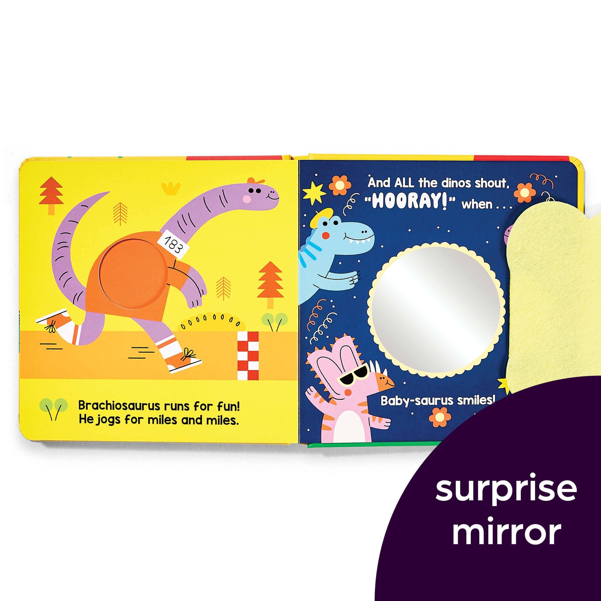 In Dinosaur Surprise, babies will love seeing their favorite dinosaur friends and lifting flaps to reveal silly, imaginary ones! This interactive dinosaur board book includes peekaboo felt flaps and a surprise mirror.