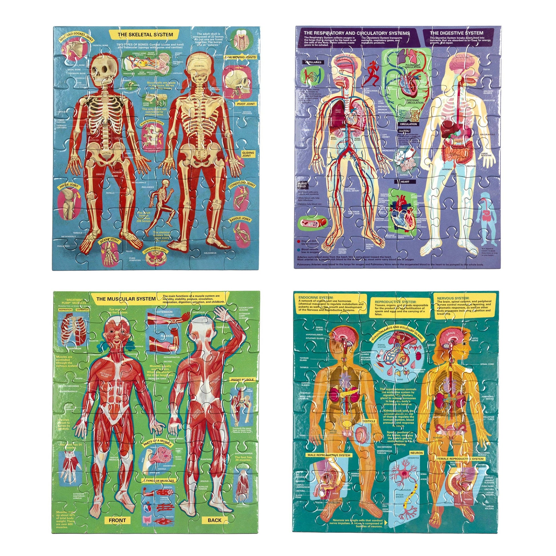 Human Anatomy, Set of 4 - 48 piece jigsaw puzzles. Included are four (4) information-packed 48 piece puzzles. Meticulously detailed, each puzzle features original illustrations of the Skeletal, Muscular, Digestive, Nervous, Reproductive and Endocrine Systems. Educational and beautiful, comes with large fold pout informational poster.