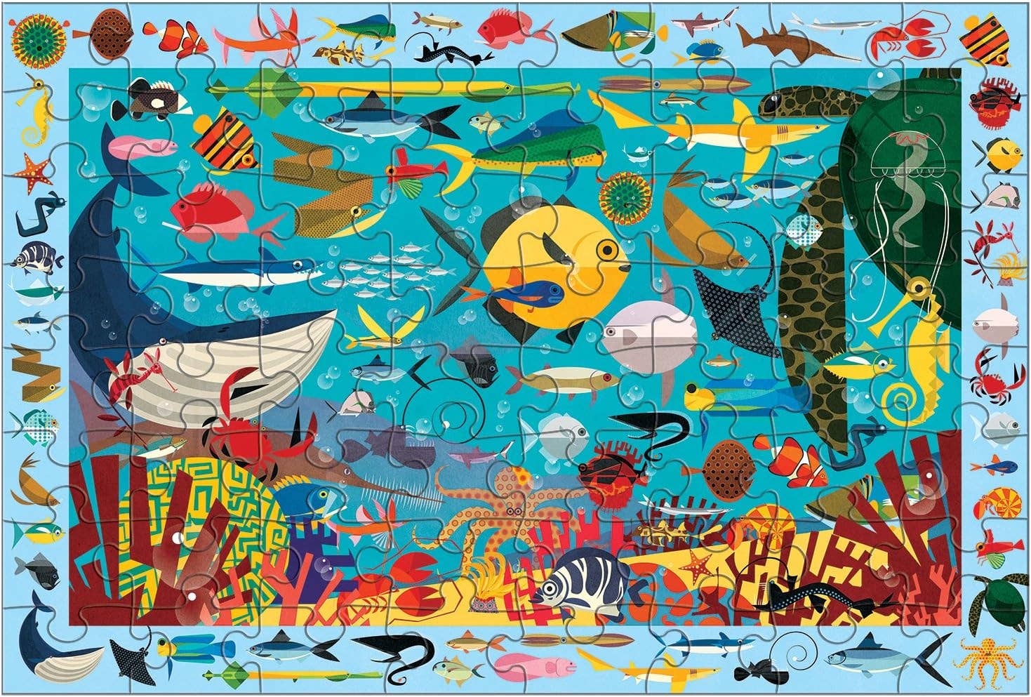 Mudpuppy's Ocean Life Search & Find Puzzle is double the fun First, children can piece together the 64 piece puzzle featuring diverse and colorful marine life living in the ocean. After putting the puzzle together, children can test their observation skills to find the 40+ sea creatures in the border around the puzzle image. They are all there, can you find them?