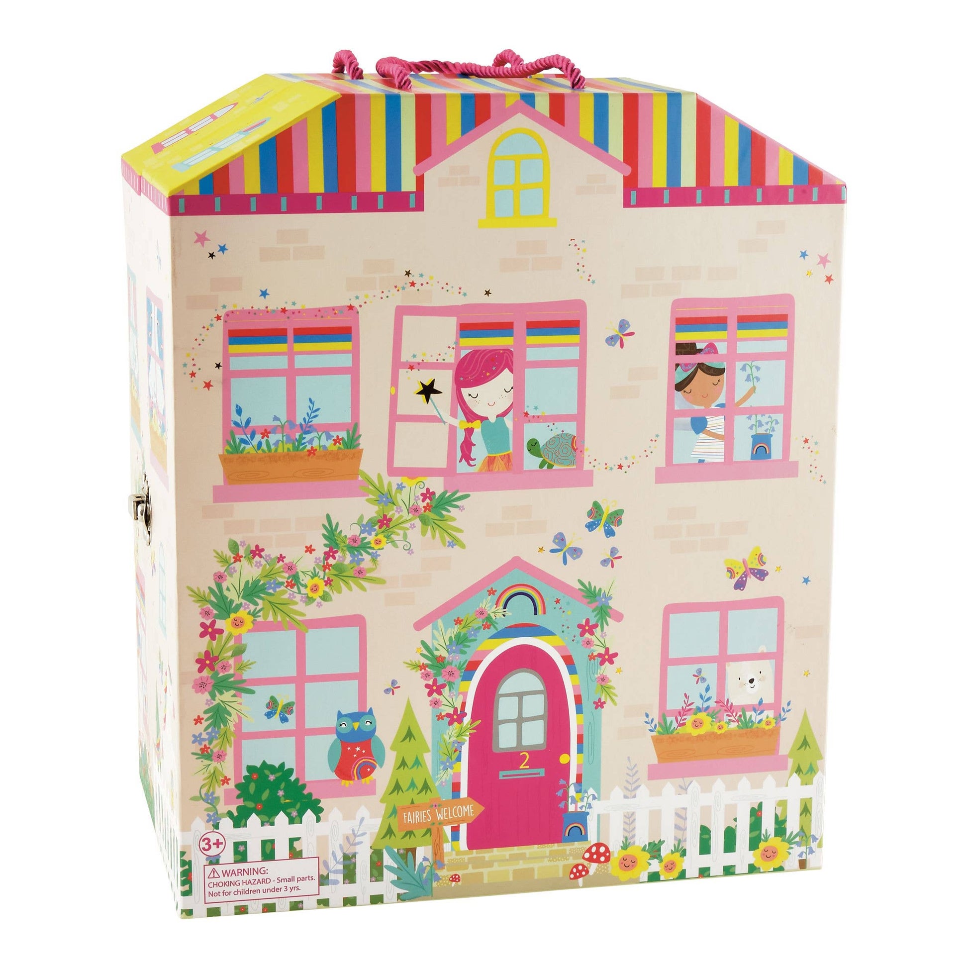 The rainbow fairy playbox comes complete with a cotton bag holding 18 amazing wooden, double sided pieces. There are fairies, flying unicorns, roller blading llamas, hula dancing bears and so much more. The house opens up to reveal 6 gorgeous rooms, all hand illustrated. There's a bathroom, a bedroom, a kitchen, a living room. Its so much fun and so colourful. Place your characters around the house and let your imagination run wild. It is fully portable with a cool carry handle should you want to show this off and take to friends to play together. Dimensions 11.8 x 9 x 8.7". Suitable for 3+