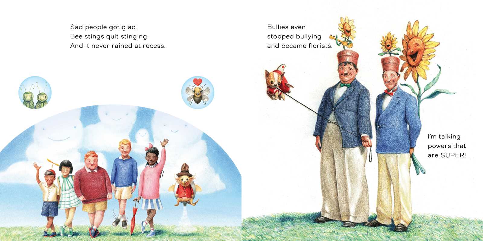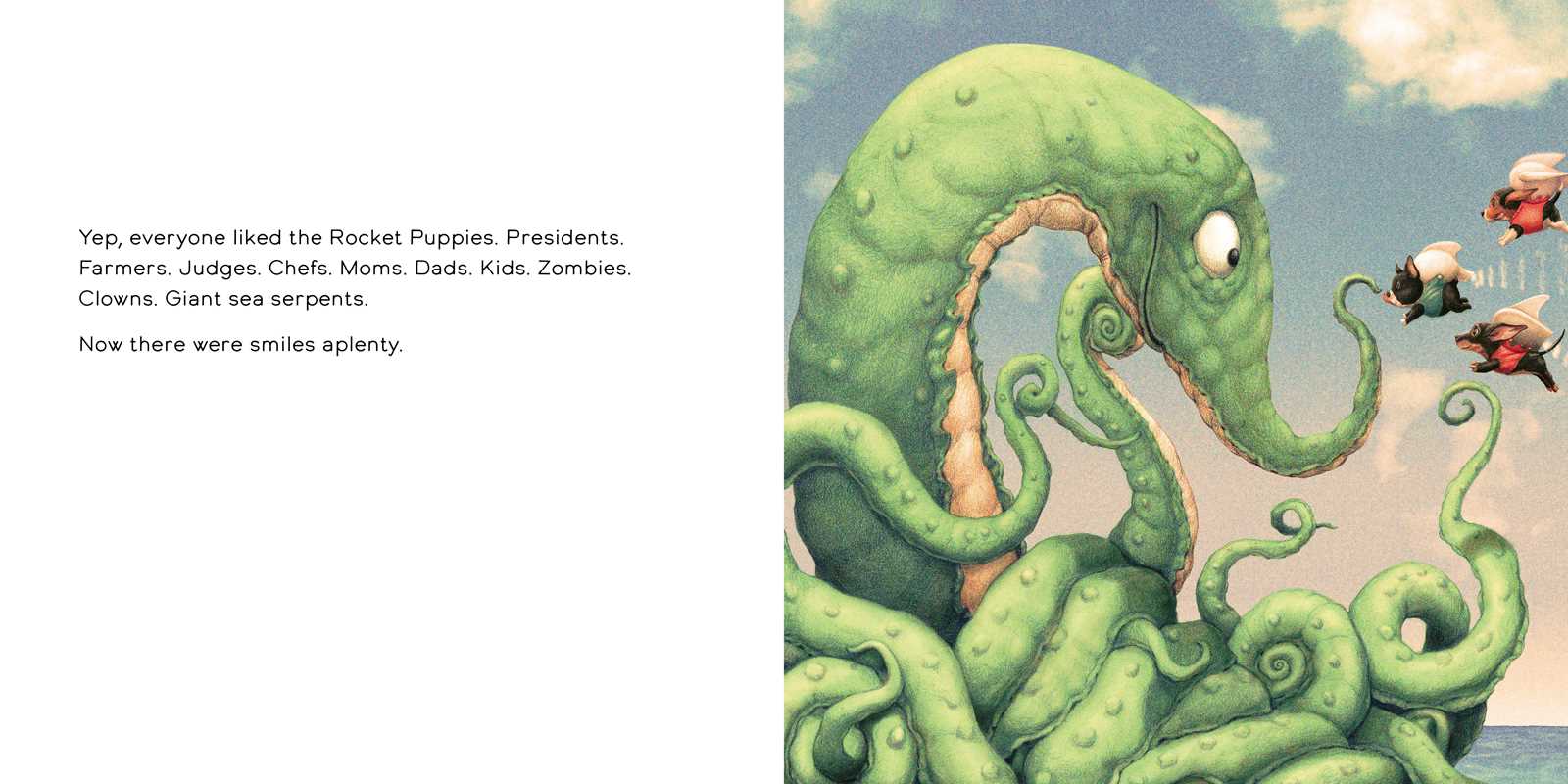 Once upon a should-have-been-happy time, the earth is feeling sort of sad. From people to bugs and birds to forks, smiles have disappeared, and bad moods reign supreme. Then, from the outer reaches of Not-from-Here, come the Rocket Puppies! These impossibly cute canines hiccup bubbles that play songs, stop bees from stinging, and keep recesses rain-free.