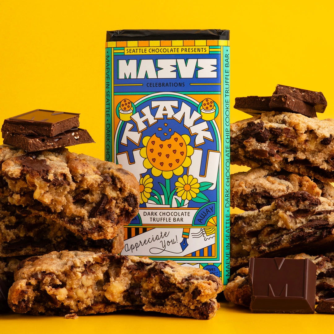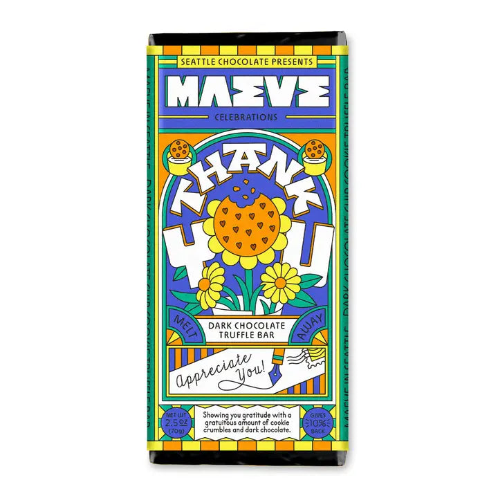This cookie doesn't crumble. It's also Vegan (yes, for real!). Our chocolate chip cookie truffle bar is stuffed with appreciation and cookie nibbles. This tasty dark chocolate bar is packed with itty-bitty, crispy chocolate chip cookie chunks. Whimsical graphics, vibrant hues and scrumptious chocolate: a mouthful of gratitude.
