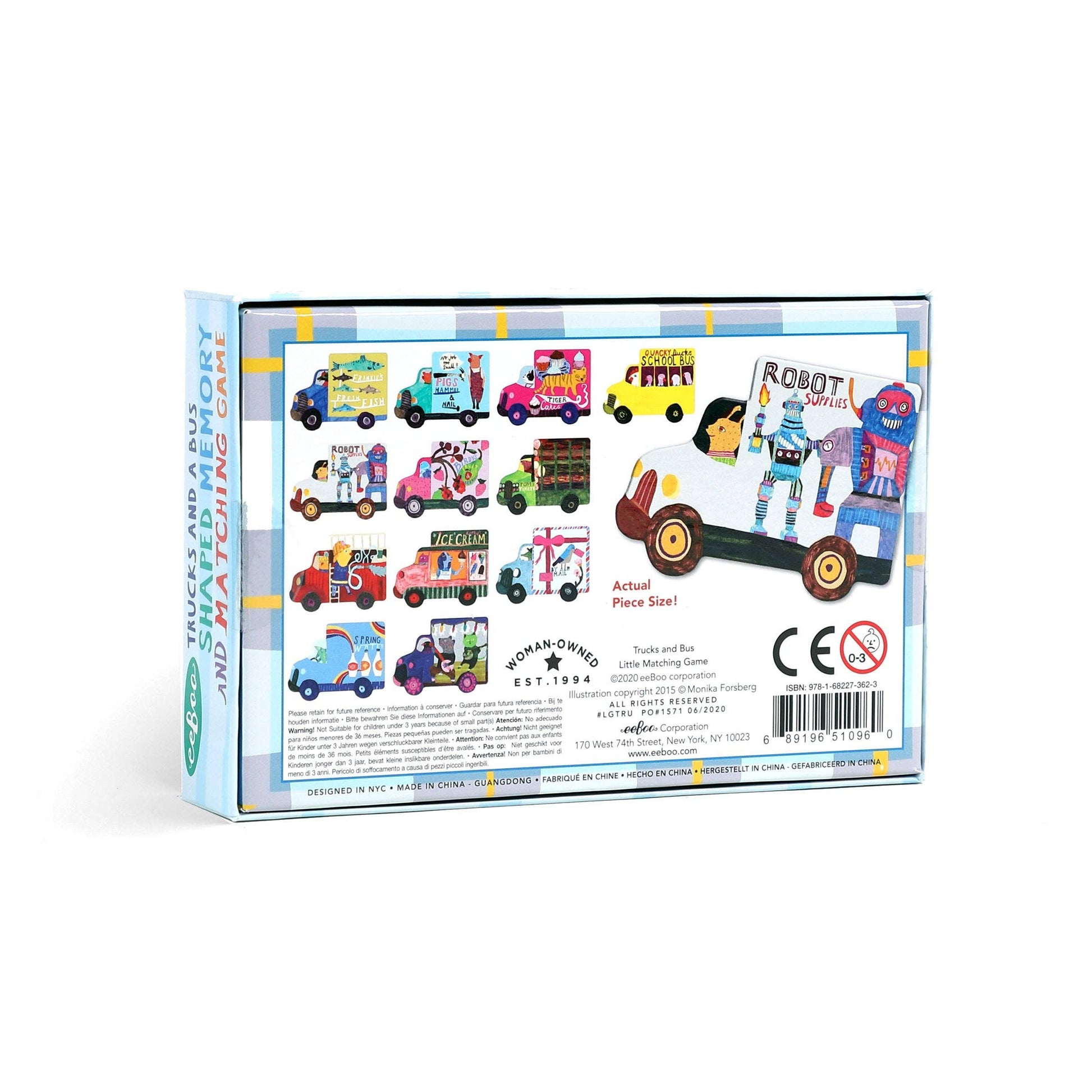 eeBoo’s Trucks and a Bus Memory & Matching Game re-envisions the classic memory game with quirky illustrations by acclaimed artist, Monika Forsberg. Played by placing each piece face down and then flipping them over to try to locate matching pairs. Memory games fine-tune concentration, cooperation, and memory skills.