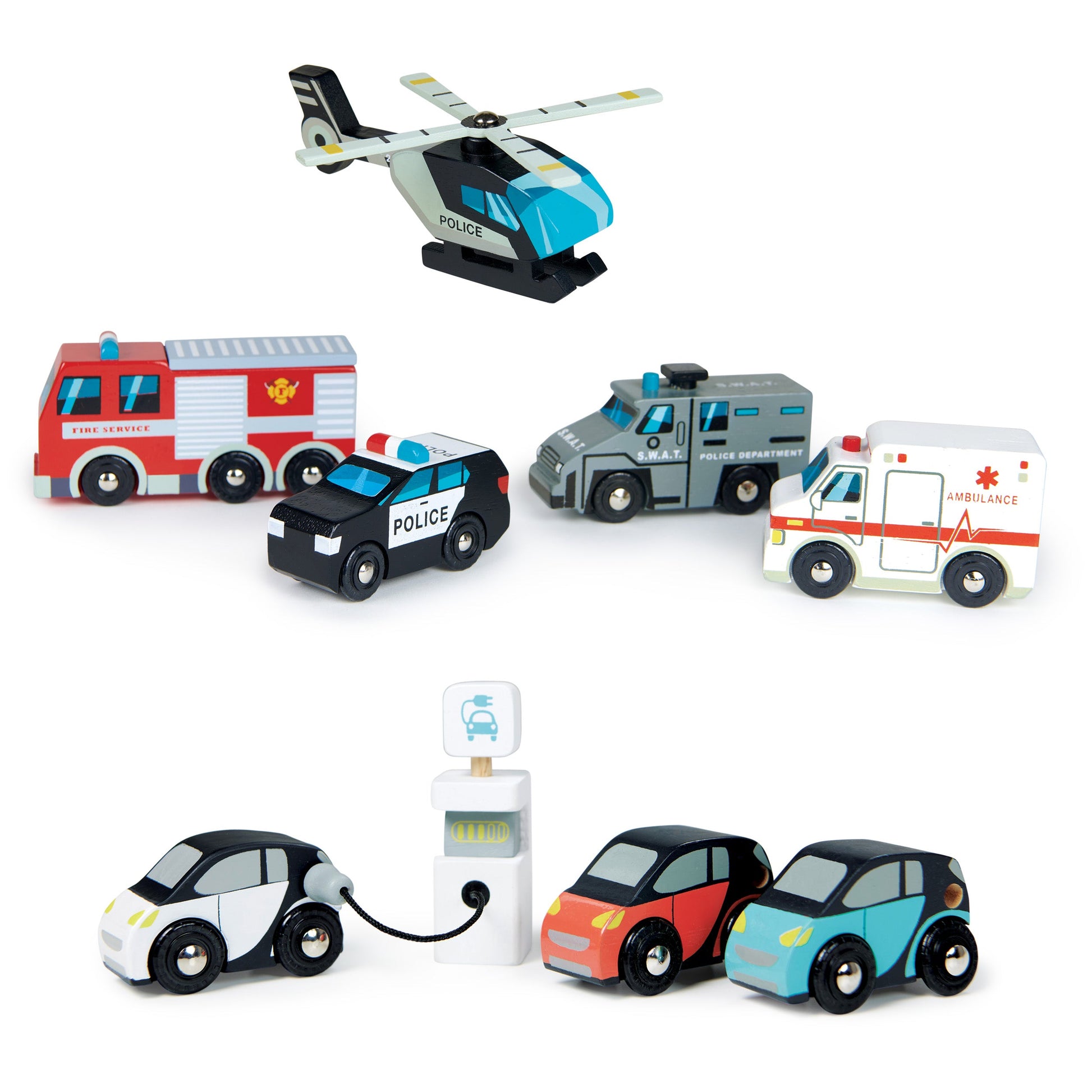 Solid wood vehicles. Set includes: helicopter with rotating blades, ambulance, fire engine, police car and S.W.A.T car.